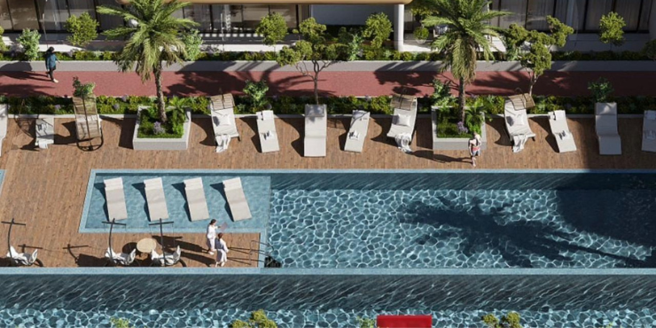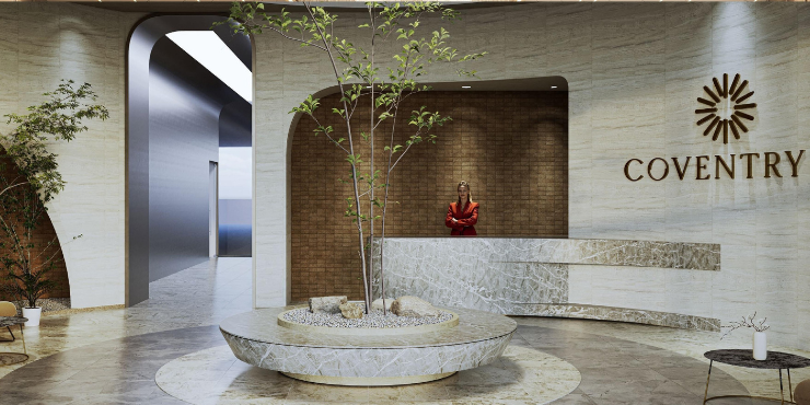Coventry Cove is a modern residential complex from developer GFS Developments, located in Dubai Industrial City, Dubai. The building includes a basement level, a ground floor, six residential floors and a roof.